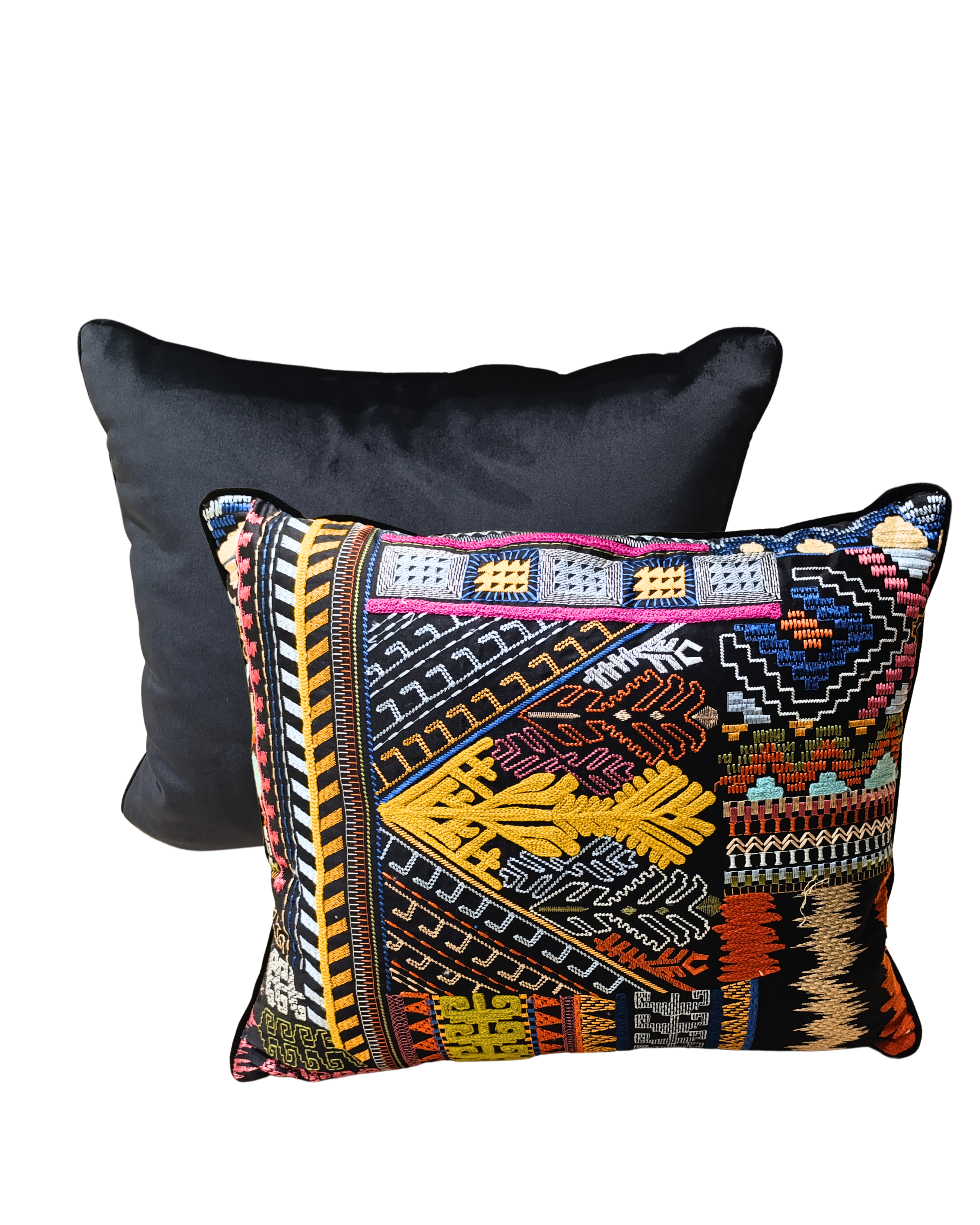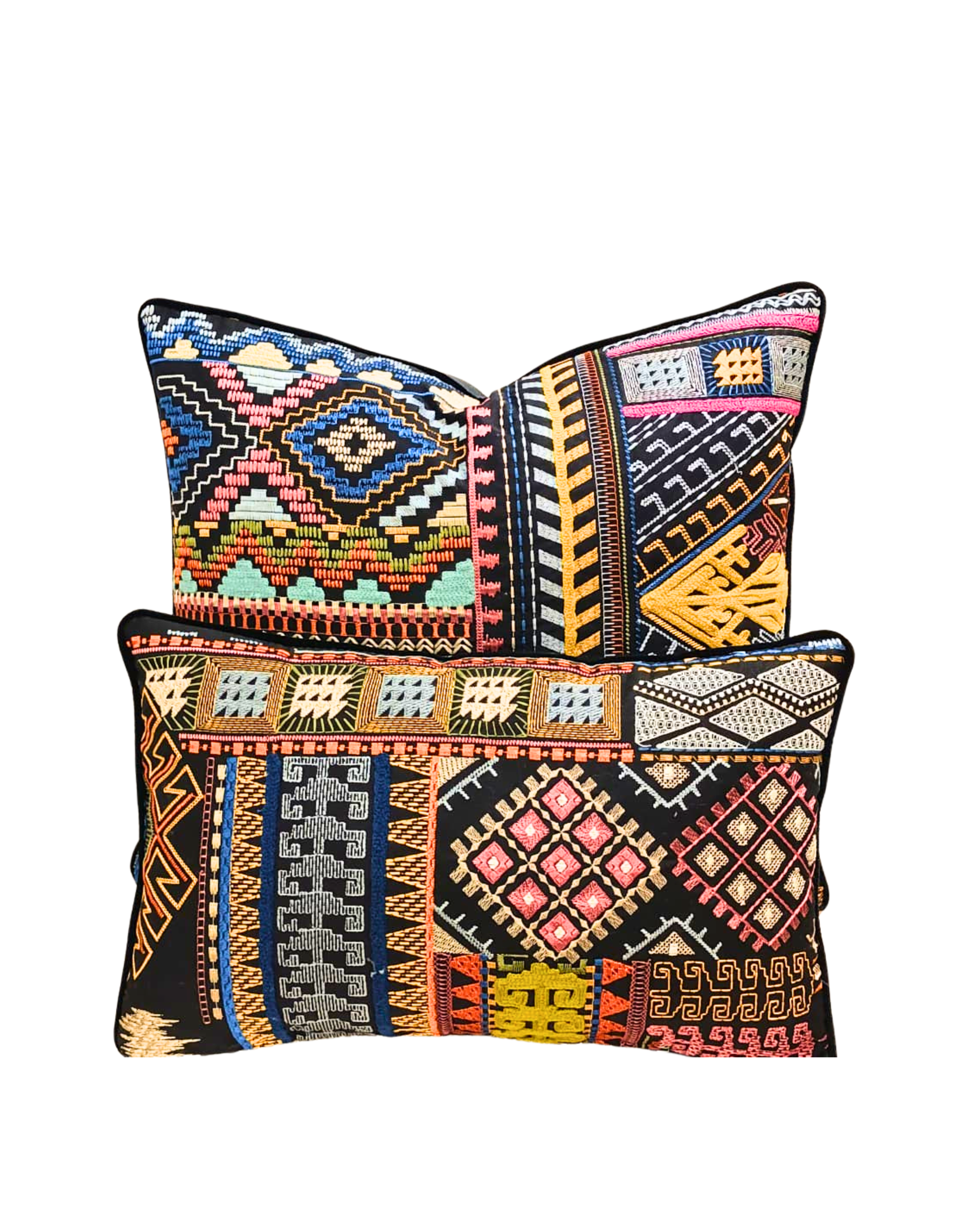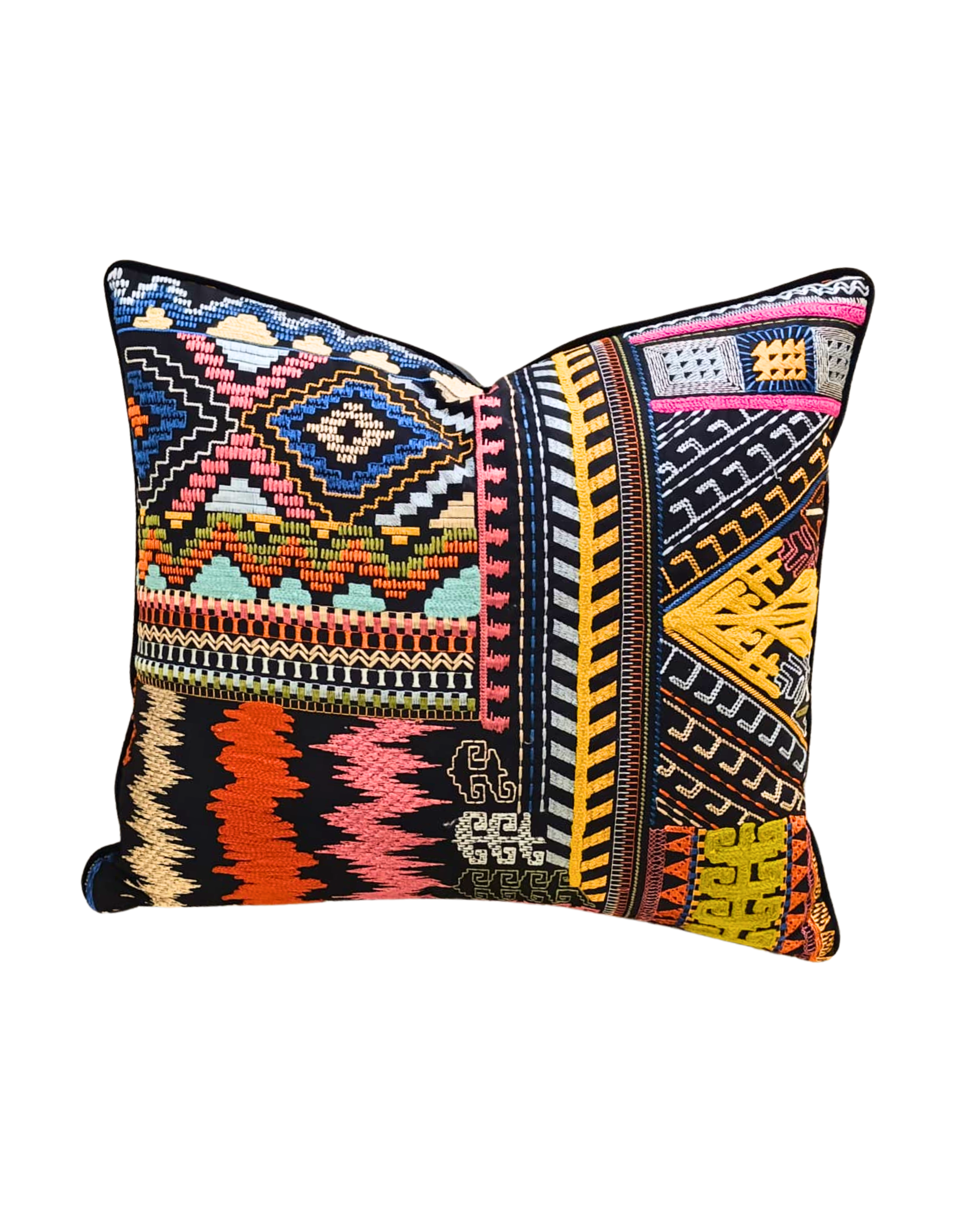 Ce coussin décoratif arbore un design richement brodé, composé d’un assemblage de motifs géométriques et ethniques dans une palette de couleurs vibrantes et contrastées. Le tissu est structuré en plusieurs sections, chacune présentant un motif distinct, créant un effet patchwork sophistiqué.