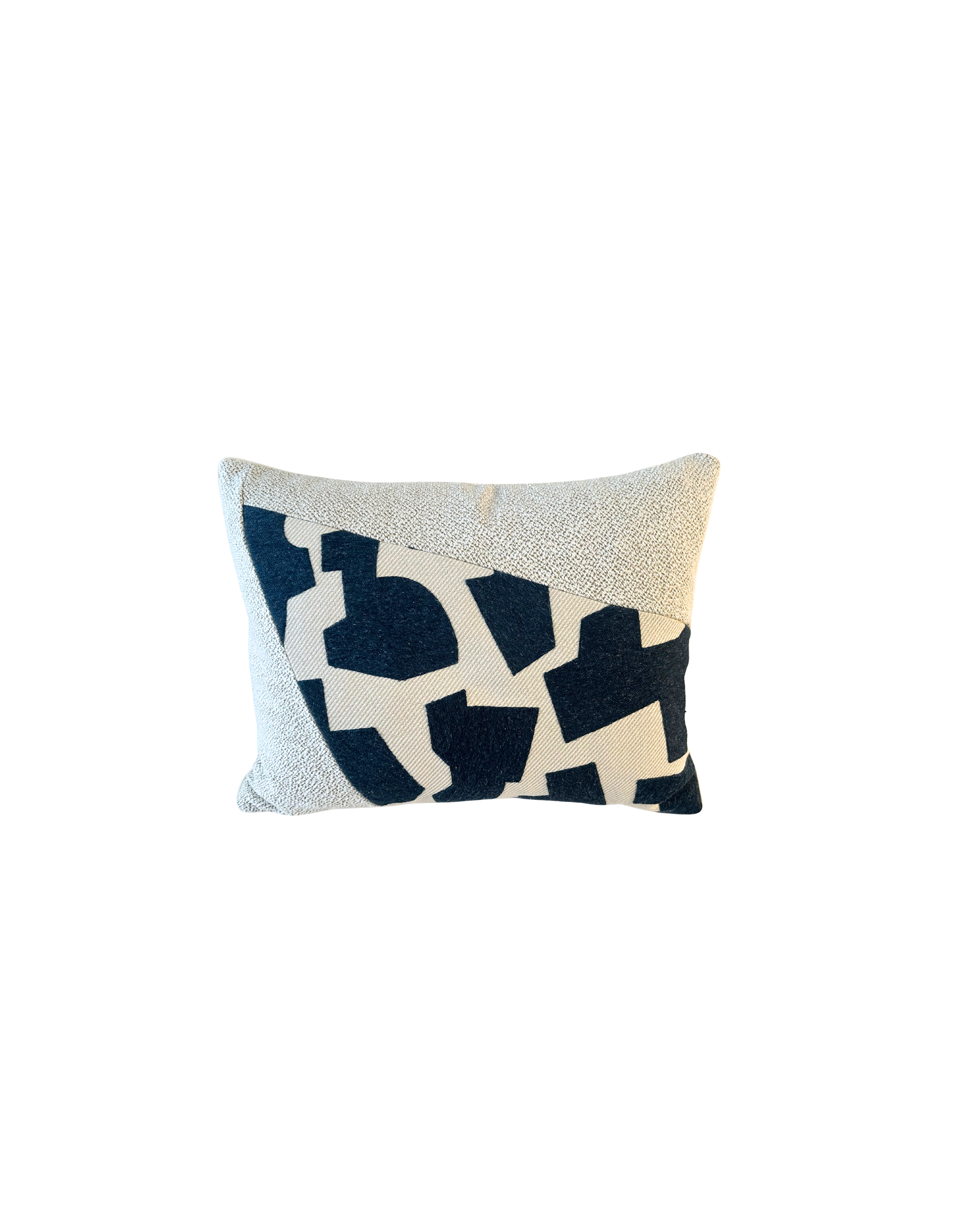 Ce coussin décoratif rectangulaire se distingue par son design contemporain mêlant élégamment texture bouclée crème et motifs abstraits bleu marine. Sa composition en patchwork moderne apporte relief, originalité et caractère à votre décoration intérieure.
