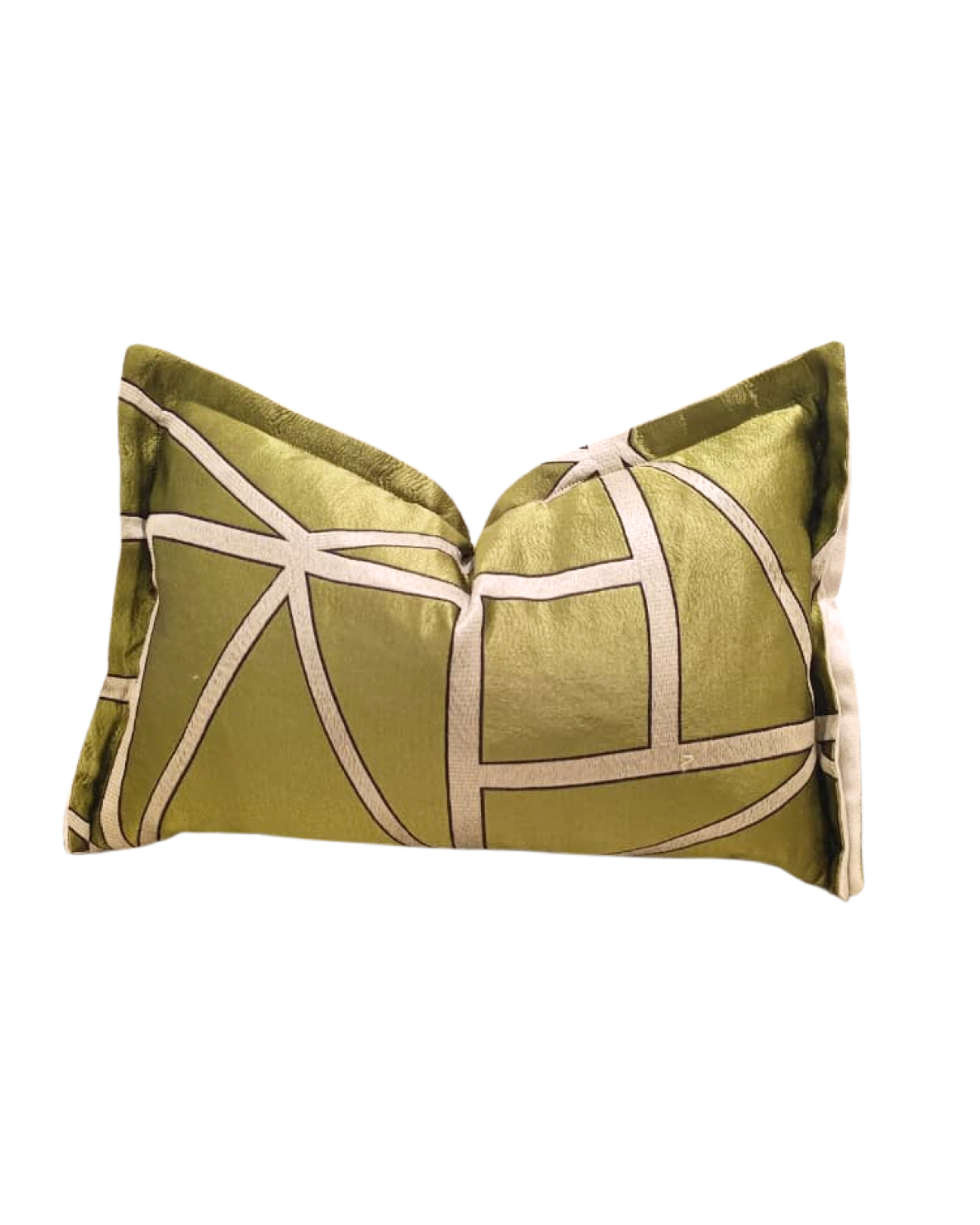 Ajoutez une touche moderne et élégante à votre intérieur avec ce coussin décoratif rectangulaire en tissu satiné vert olive. Ses motifs géométriques gris clair offrent un style contemporain unique, idéal pour sublimer un canapé, un fauteuil ou un lit avec raffinement.