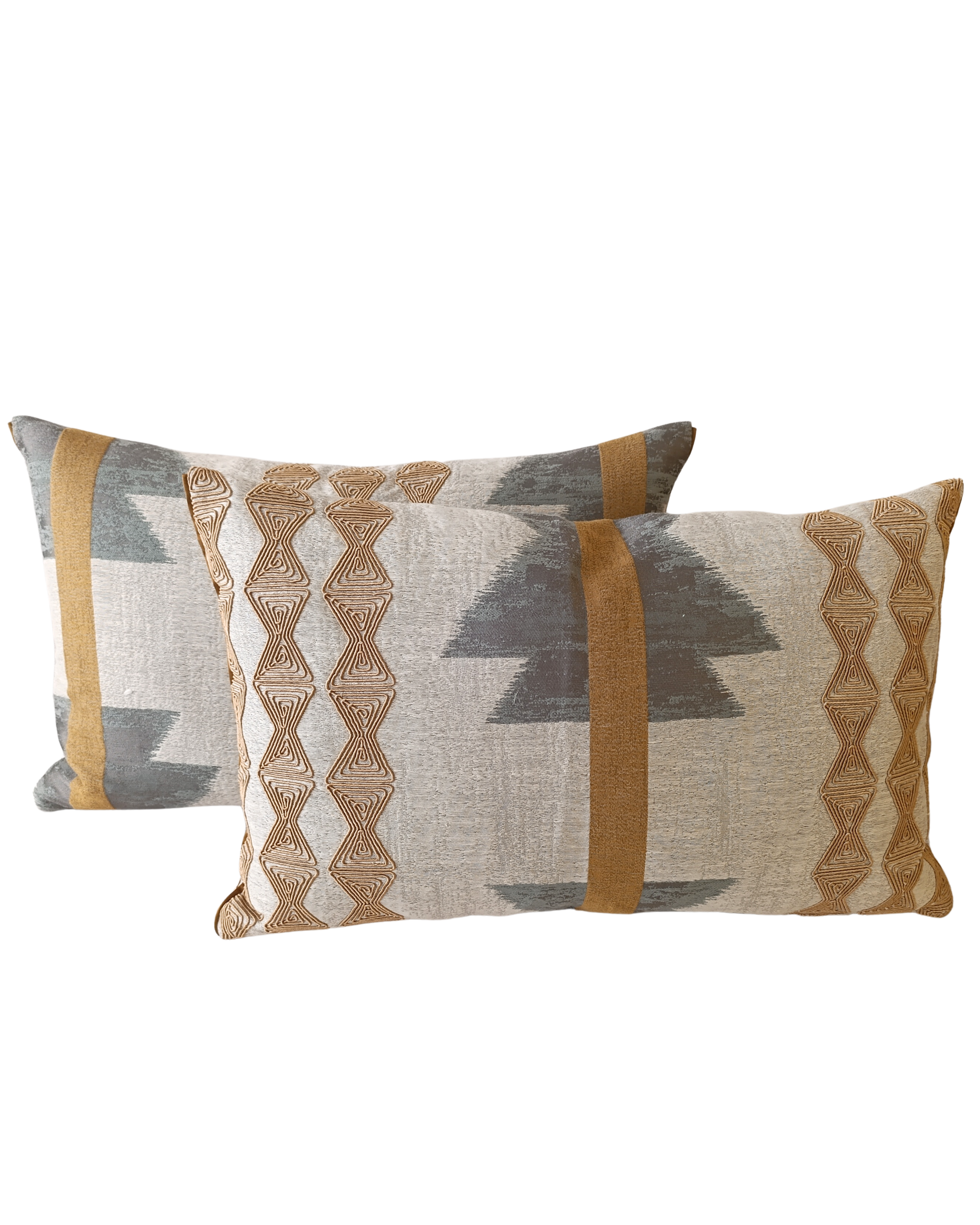 - Design Bicolore & Texturé : Le corps du coussin est fait d'un tissu en polyester doux et velouté de couleur beige/écru. Les motifs géométriques sont mis en valeur par des blocs de couleur gris taupe et un jaune moutarde / ocre vibrant sur les bords.