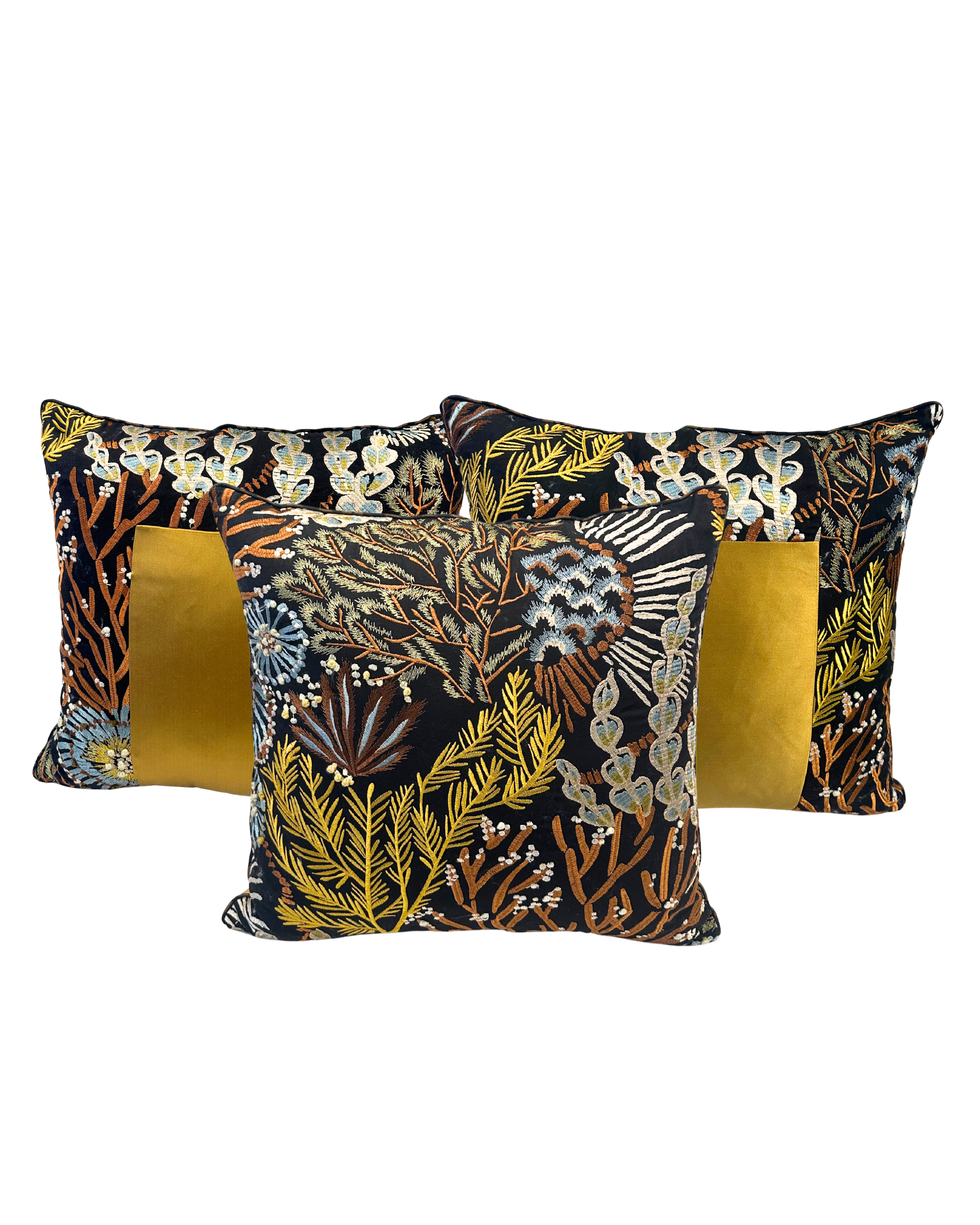Les motifs végétaux, composés de feuilles et de branches stylisées aux nuances de bleu, vert, ocre et brun, créent un contraste riche et chaleureux. Le velours doré, quant à lui, capte la lumière et ajoute une note de prestige, donnant au coussin une allure haut de gamme et intemporelle.