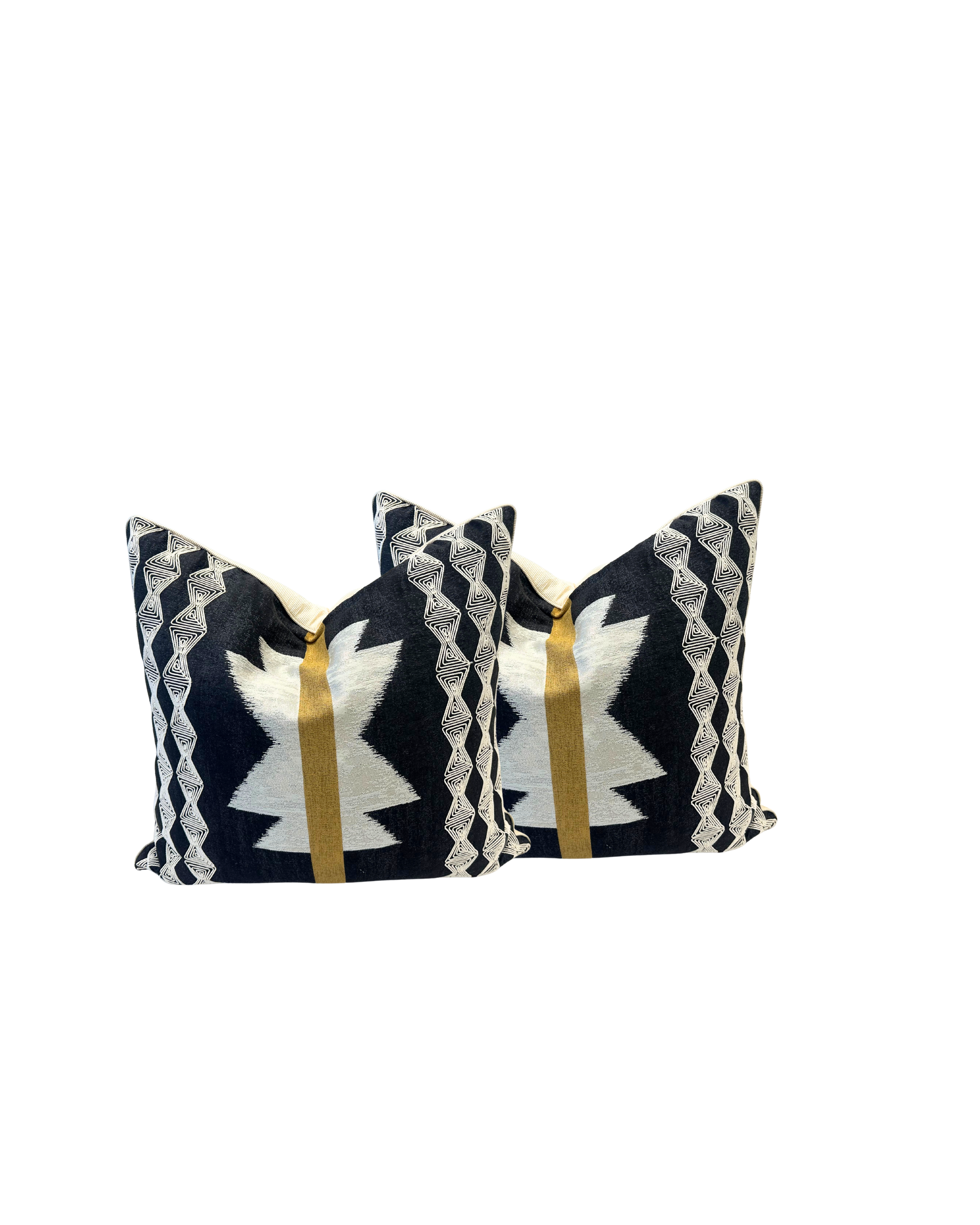 - Face A - Motif Tissé Audacieux : L'avant est orné d'un motif géométrique complexe et structuré, tissé dans un tissu de type 'Madurel' (ce qui peut évoquer une texture riche ou un nom de collection). Les motifs noirs intenses contrastent avec le beige clair et une bande centrale ocre/jaune pour un rendu visuel puissant, inspiré du style ethnique chic.
