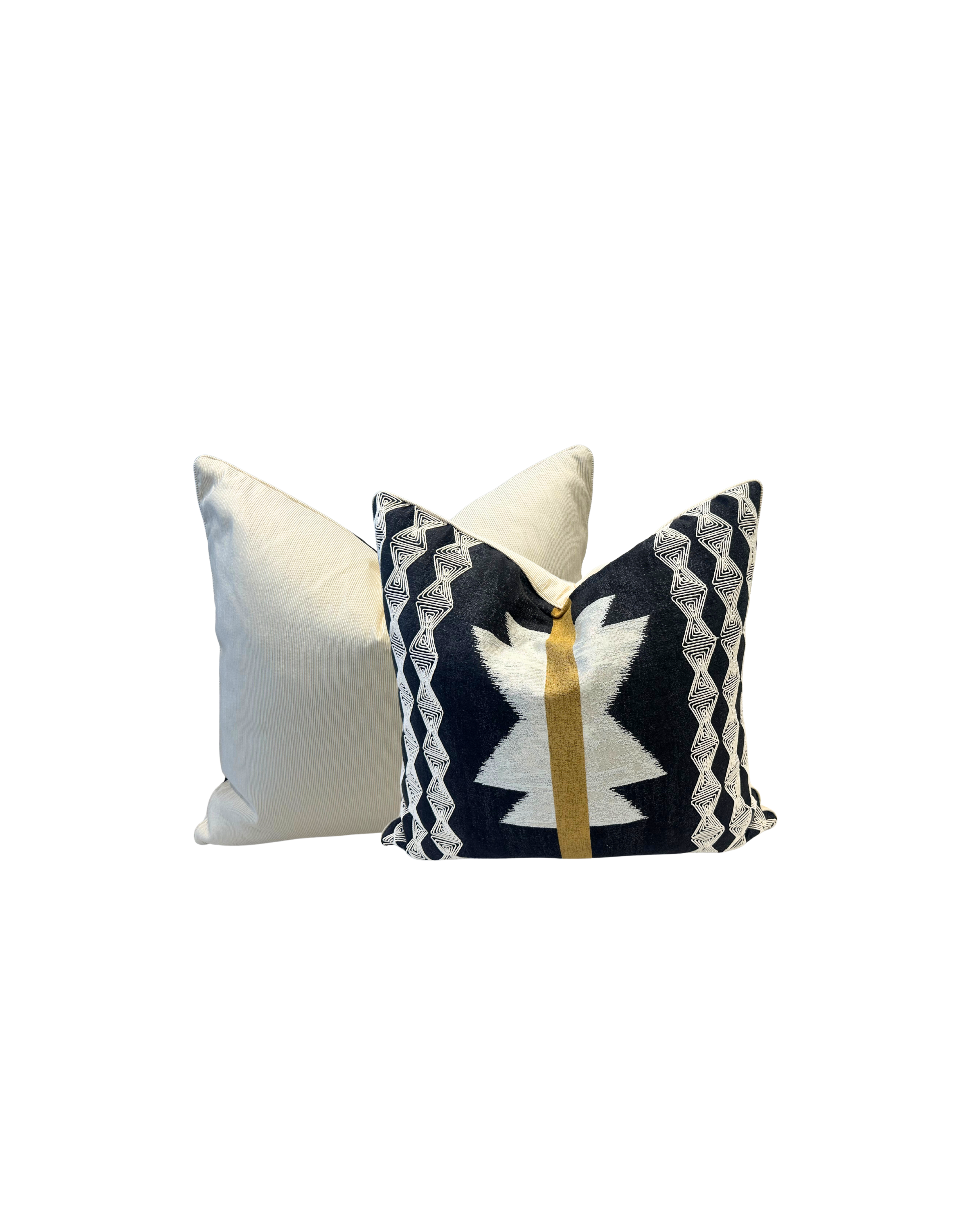 Pièce maîtresse de décoration, ce grand coussin double-face (58x54 cm) offre deux styles en un. Un côté présente un motif géométrique tissé audacieux (tissu Madurel) noir et beige, l'autre une texture veloutée unie. Rembourrage en plumes pour un confort exceptionnel.