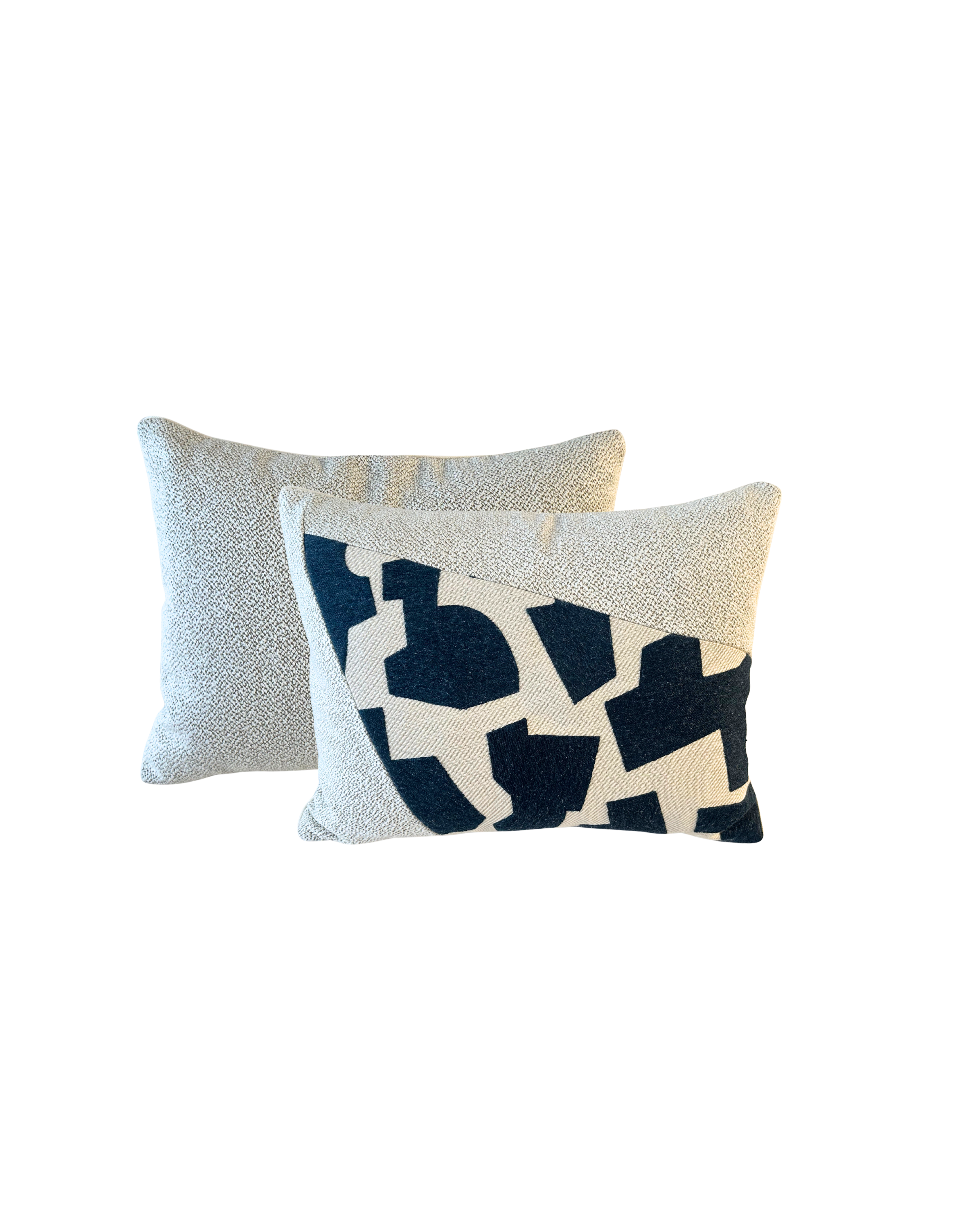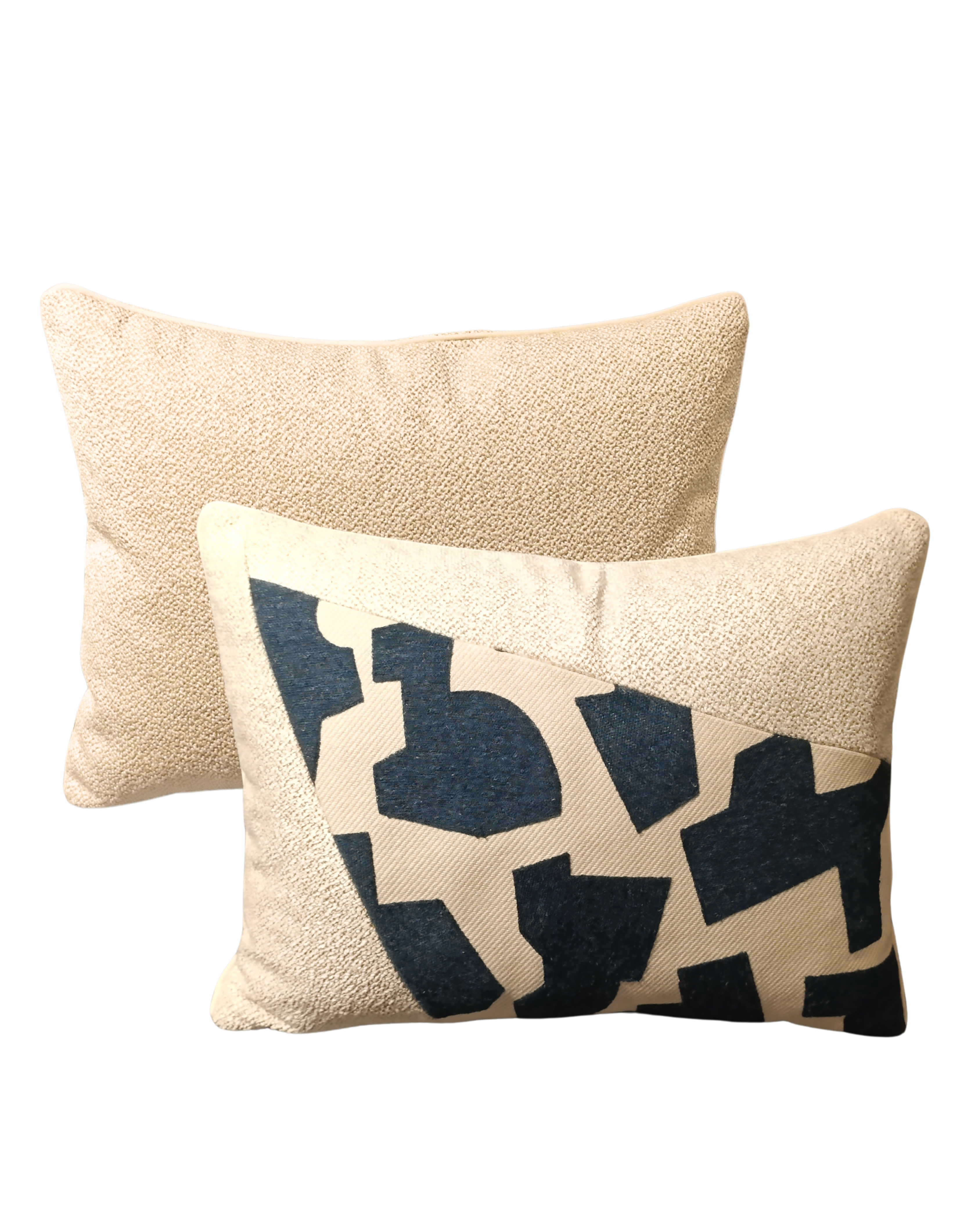 Ce coussin décoratif rectangulaire se distingue par son design contemporain mêlant élégamment texture bouclée crème et motifs abstraits bleu marine. Sa composition en patchwork moderne apporte relief, originalité et caractère à votre décoration intérieure.