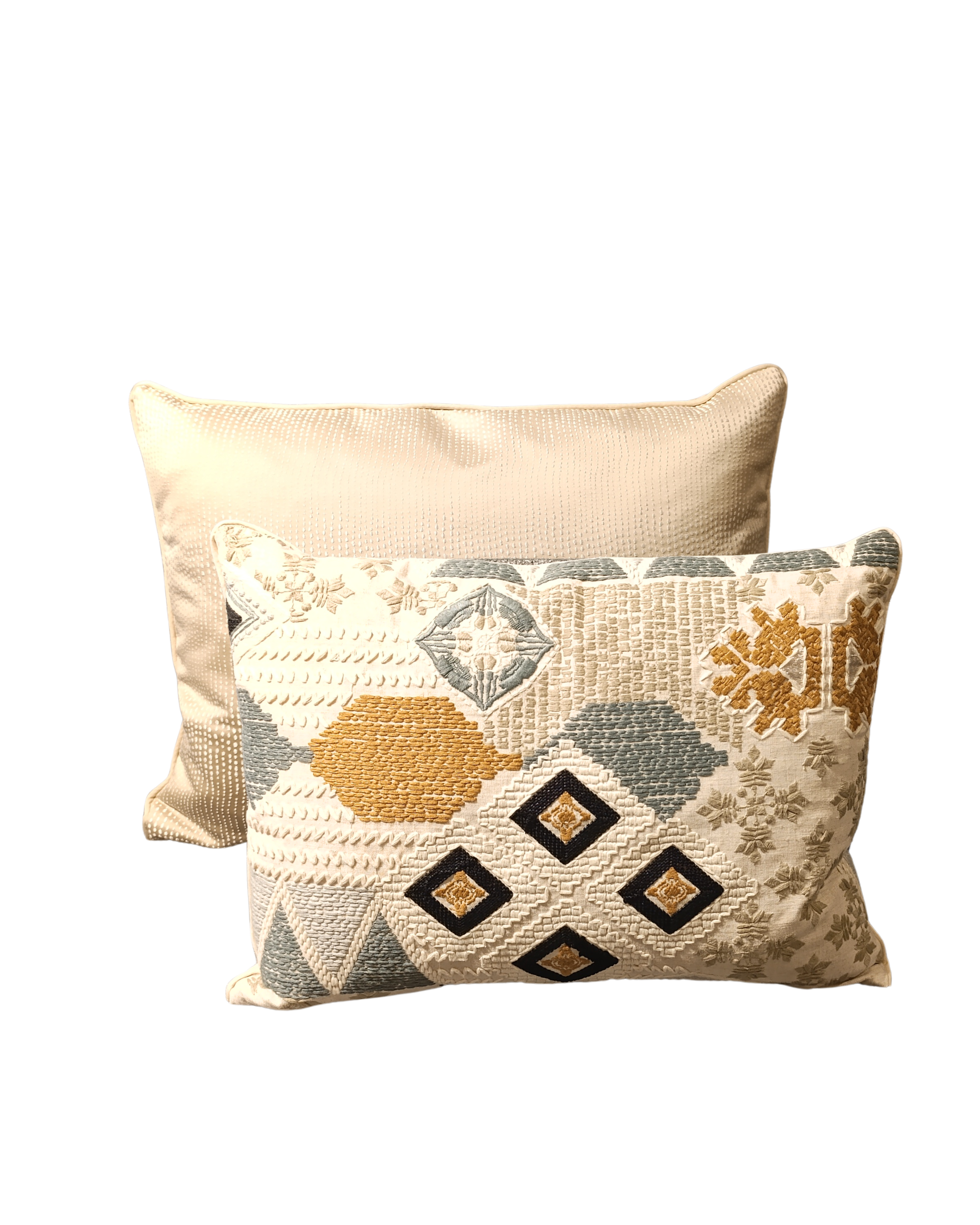 - Face A - Géométrie Brodé Unique : Cette façade est une mosaïque de motifs géométriques et de formes variées (triangles, losanges, médaillons) dans une palette de couleurs élégantes incluant le beige, le gris-bleu, l'ocre/moutarde et le noir. Les broderies créent un relief tactile et sophistiqué, ajoutant de la profondeur à votre décor.