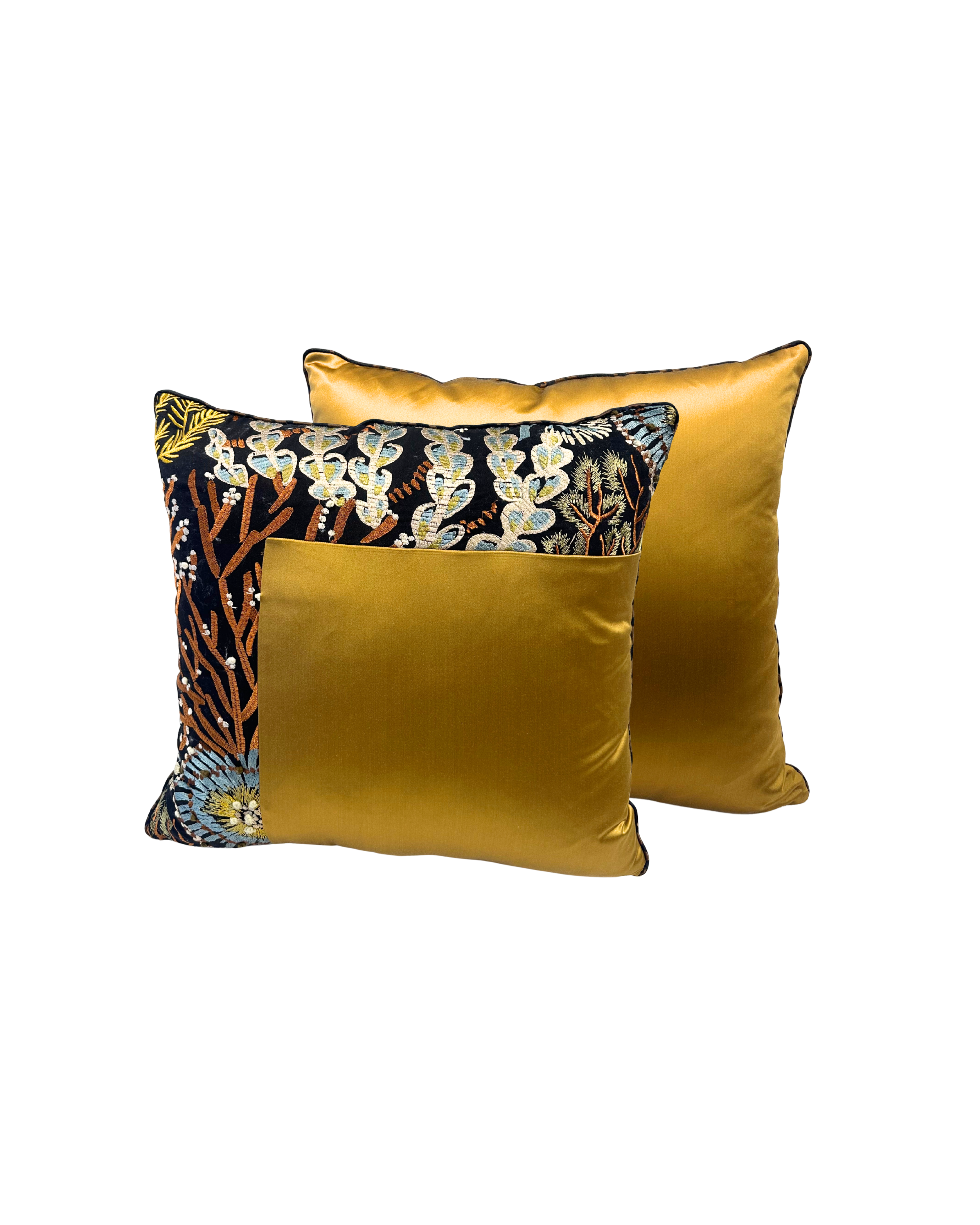 Les motifs végétaux, composés de feuilles et de branches stylisées aux nuances de bleu, vert, ocre et brun, créent un contraste riche et chaleureux. Le velours doré, quant à lui, capte la lumière et ajoute une note de prestige, donnant au coussin une allure haut de gamme et intemporelle.